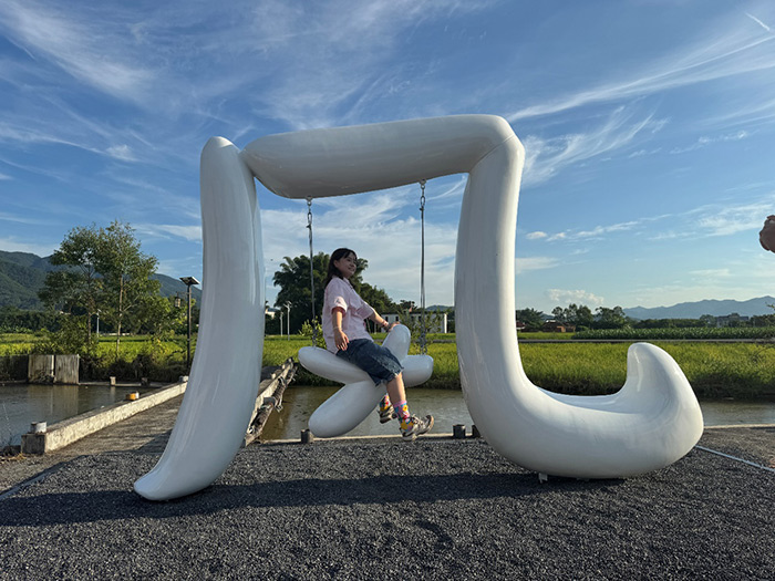 黃海波《漢字樂園》是一件互動性很強的作品,藝術家以漢字為設計元素,源自山區兒童詩歌,將“風、傘、大、林、人”等字的意象轉化為互動設施,把孩子的想象變為可觸的詩意體驗,連接公益與文化溫度。
