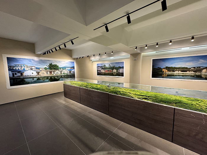 在米香中心二層是何崇岳的攝影作品《風水蕉嶺》,何崇岳是一位觀念攝影藝術家,他從衛星云圖上查看以蕉嶺的水系分布,從而發現并拍攝了幾座在水邊的圍龍屋建筑,作品以正面角度展示了圍龍屋令人驚嘆的外觀,這些莊嚴中不失華麗的建筑影像如一幅幅靜默的建筑肖像,無聲地向觀眾訴說著客家先民厚重悠遠的歷史,宗族記憶、防御智慧與生活往昔。