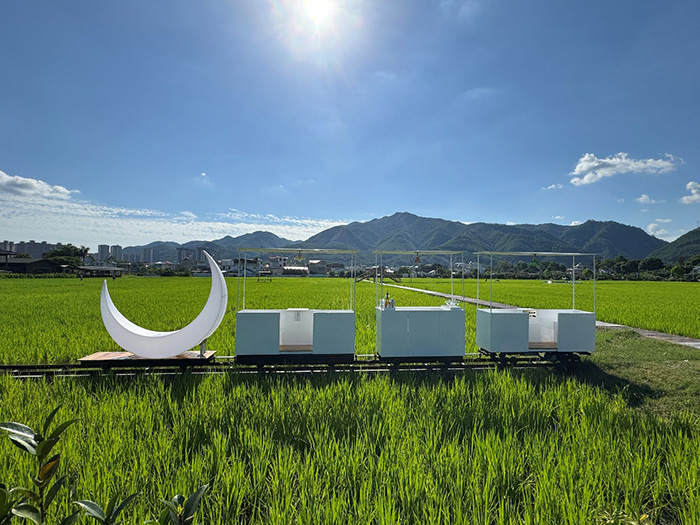 最先映入眼簾的,是稻田中的“小火車”,這是藝術家刁勇(不是美術館)的作品《稻田里移動的酒吧》,藝術家將火車頭被巧妙設計成一輪皎潔的“明月”,車廂則化身為精致的小型酒吧。游客可以坐在移動的吧臺上,一邊品嘗以客家米酒調制的特色飲品“硒望”,一邊與同伴暢談歡笑。伴隨著蒸汽與稻香,小火車緩緩駛過田間,帶來一種獨特的田園慢生活體驗。