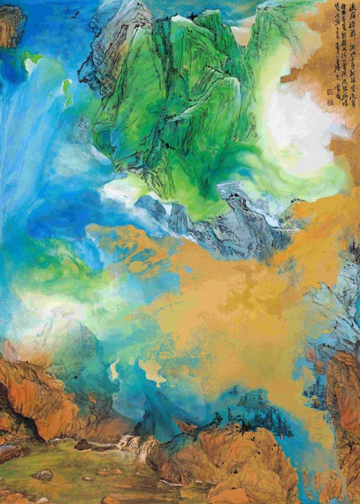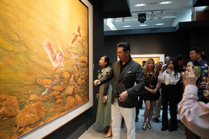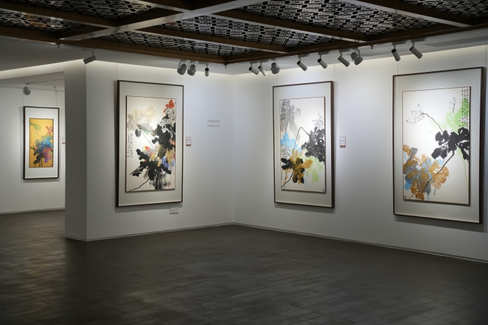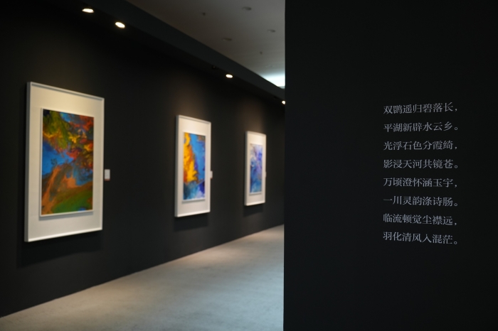 走進展廳,中國傳統繪畫的古典味道融匯著現代生活的審美氣息撲面而來。本次展覽共展出76幅作品,飽含新宋式系列、宇宙系列、荷花系列、屏風系列、書法系列五個系列。其中“新宋式系列”代表作《流金旋舞》《云扶玉嶂》意境悠遠,渾然天成。此次展出了藝術家精心創作的十幅震撼人心的潑彩山水。