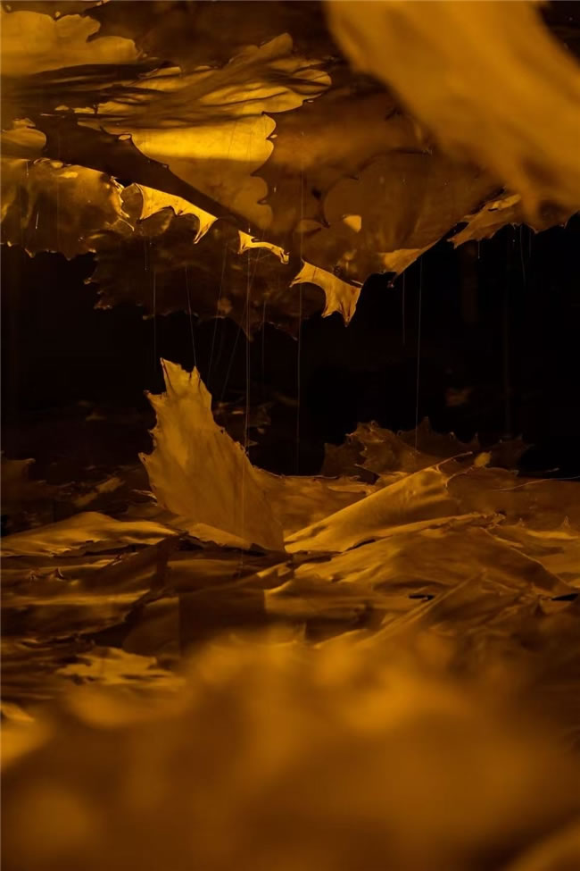 展覽聚焦于補天行動的第八十日——蒼穹即將完整的臨界時刻。藝術家運用天然材料與綜合媒材,塑造出象征“天空裂痕”的空間意象。作品通過高度感官化的藝術語言,將文本神話轉化為可觸可感的身體經驗,邀請觀眾進入介于破壞與修復、混沌與秩序之間的閾限空間,串聯起遠古想象與當下感知的儀式現場。觀眾在穿行、觸摸中,不僅可以直觀感受到材料的生命力,更在互動中開啟一場跨越古今的時空之旅,思考與聆聽“文明回響”——古老智慧從未遠離,它始終與當代人的精神世界緊密相連。