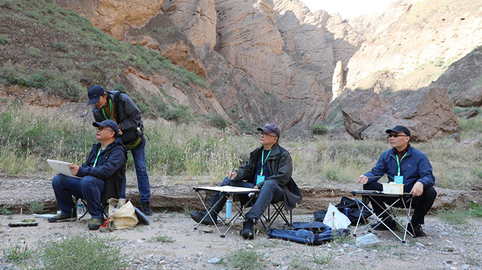 在石林深處,面對橘黃色砂礫巖的豐富肌理與雄險姿態,藝術家們支起畫架,展紙研墨,進入凝神聚氣的創作狀態。這一刻,地質的肌理被轉化為水墨的皴擦,山石的氣韻凝聚為畫面的魂魄。創作已非簡單的風景再現,而是基于地理真實的藝術升華,是主體精神與客體自然的一場深度對話。