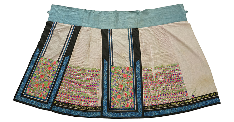 藍色暗花緞地繡花鳥紋夾棉闌干馬面裙 清 長118.2厘米 寬100.8厘米 北京服裝學院民族服飾博物館藏