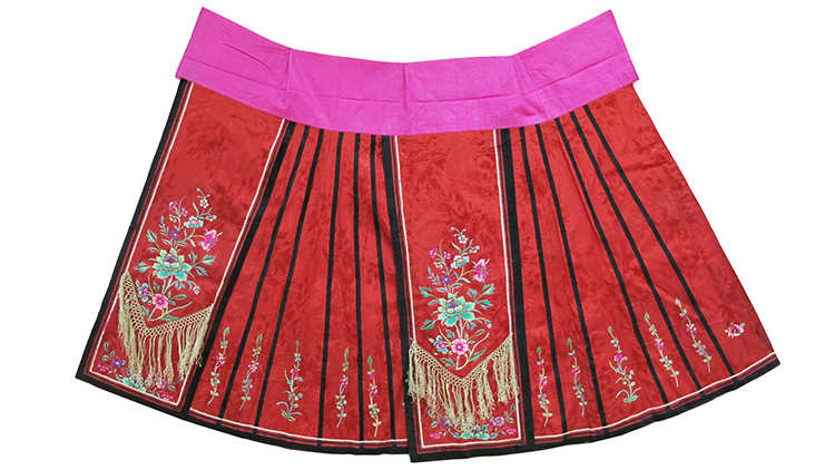 紅色提花綢刺繡花卉紋闌干馬面裙 二十世紀初長91厘米 寬177厘米 北京服裝學院民族服飾博物館藏