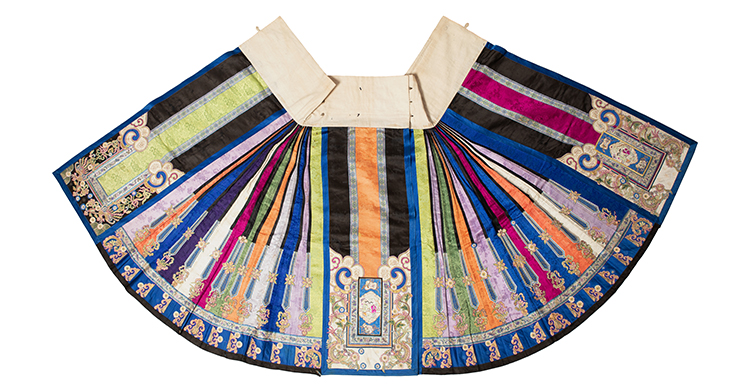多色緞地繡庭院仕女綴花卉紋月華馬面裙 清 長94.5厘米 寬121厘米 廣州博物館藏