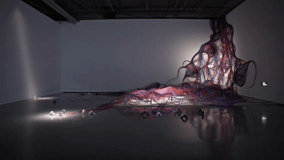 《脈動》莫丹洋、陳盅含、韋子怡、秦源浩 紅藍電線,推桿/旋轉電機 450x500x380cm
