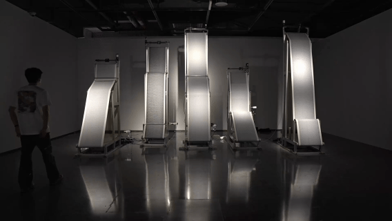 《候雨》趙致遠、王瀚葎 水寫布、履帶裝置、絲杠交互裝置、鋁型材 350x200x750cm