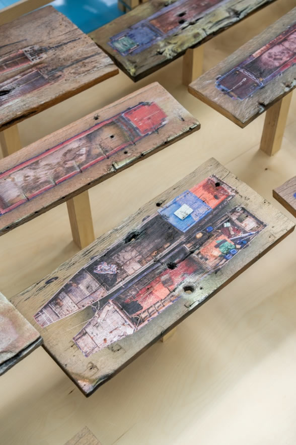 從河流中獲取的各種船的圖像,打印在老船木上,再放回河流中隨水漂流。圖像通過老船木重新獲得了現實空間中的漂流體驗。