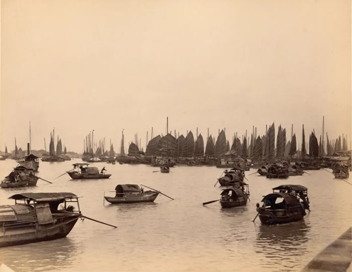 19世紀廣州沙面租界與老城之間的運河景象。這條人工運河是當時中西社區的分界線,一側是秩序井然的租界,另一側是舟船云集、人口密集的中國傳統城市空間