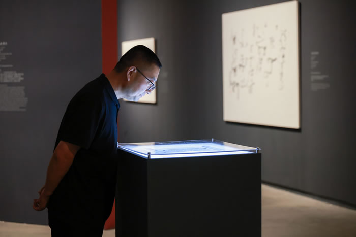 展廳中,傳統手稿與墻上極具當代性的書法作品并置,正體現了這種“生長”:它不是僵化的結果,而是一個流動、不斷生成的過程?!笆睅硪环N再生感,讓觀眾感受到他懸腕揮毫的率性,這正是文脈的積蓄以及持續的生長性。
