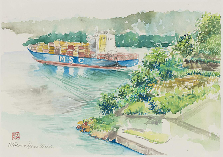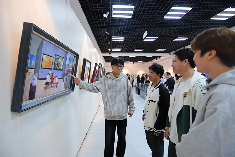 展覽現場,創作者為現場觀眾耐心細致地講解畫作背后的故事。參觀者悉心聆聽,不時拿出手機記錄畫作細節,遇到感興趣的內容還會主動與創作者交流——有觀眾好奇巴拿馬運河畫作中船閘的運作原理,創作者便結合當地地理特征與航運歷史細細解答;也有觀眾分享自己游覽揚州古運河的經歷,與創作者探討運河景觀在不同文化語境下的藝術表達,展廳內滿是跨文化交流的熱烈氛圍。