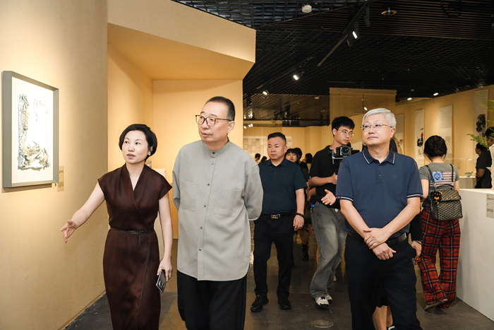 嘉賓在現場觀展,從左至右:榮寶齋廣州、深圳總經理陳目,中國民間文藝家協會主席潘魯生,深圳市文聯黨組書記、主席劉文斌