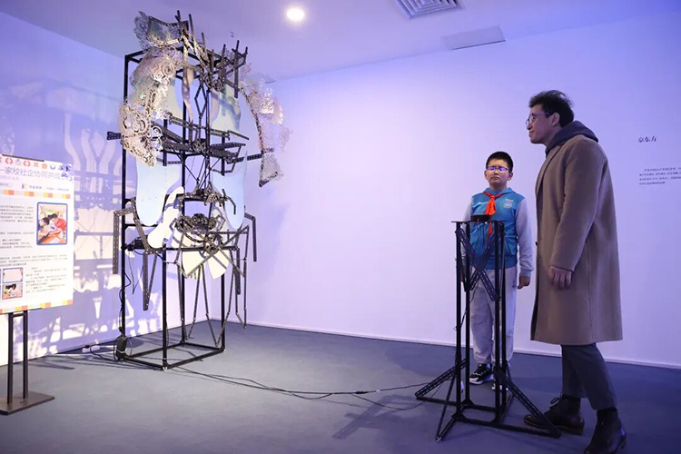漫步展廳,既有《若花·序章》《鼓舞共樂》《龍宮戲影》等眾多數字互動式體驗作品,讓觀眾沉浸式感受科技藝術的魅力;也有《亮亮視野(LLVISION)眼鏡》《未來黑科技顯示系統》等來自亦莊企業的明星產品,直觀呈現區域產業硬實力;更有北京亦莊實驗小學學生帶來的“亦小互動展示機器人”“智能喂貓裝置”“智能安全門”等創意作品,這些作品均由孩子們以校園生活、家庭場景及首屆人形機器人半馬賽事為靈感發明設計,盡顯科技素養賦能未來的蓬勃朝氣。