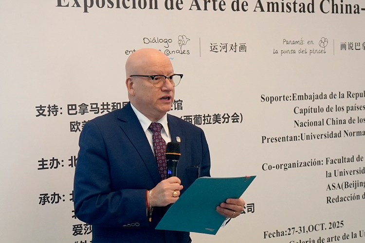 2025年10月27日下午,“中國-巴拿馬友好藝術巡展”在北京師范大學藝術樓京師美術館開幕。本次展覽以“運河對畫”和“畫說巴拿馬”為主題,通過藝術的語言構建起中巴兩國文化交流的橋梁,為金秋的北京增添了一抹亮麗的文化色彩。