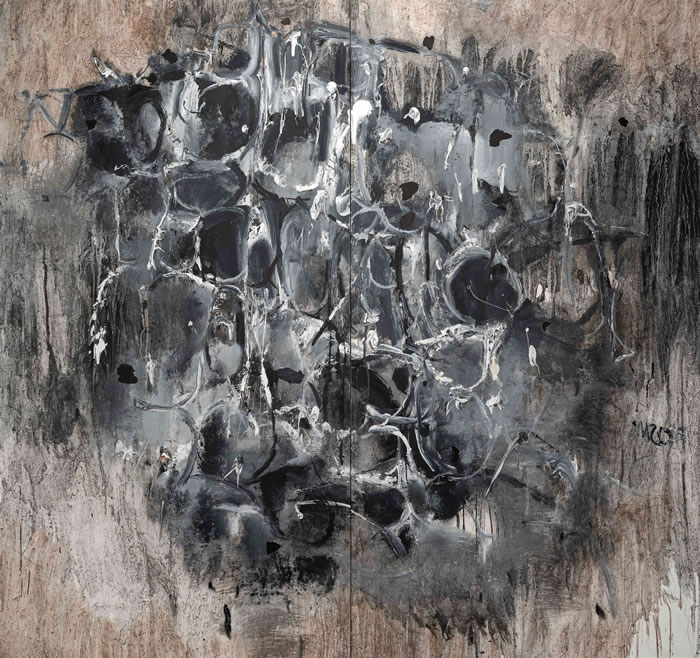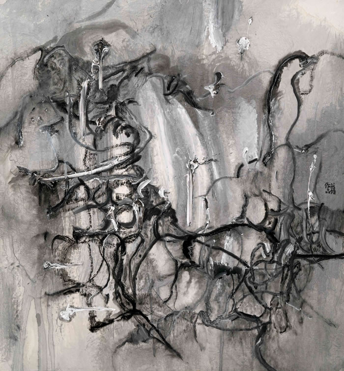徐善循將自己的抽象繪畫命名為“鴻蒙系列”,該系列開始于2023年。經過十多年的錘煉,這類創作已臻成熟?!安菽净揖€”是徐善循發明的用于創作抽象繪畫的材料和形式,通過這種獨特的材料和形式,他創造了一種新穎別致的抽象繪畫風格。黑白線條依然是這類抽象繪畫造型的骨干,而作為畫面的背景或基底,徐善循采用了包括水墨暈染、油彩厚涂和丙烯滴灑在內的各種手法,營造出一種宇宙蒼茫、鴻蒙未開的超現實意境。