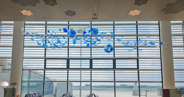 藝術家把整個嶺南的春天都掛在了天花板上:這些仿佛被南風吻過的藍色花瓣,藏著不少小心思——它們有著通花瓷般的玲瓏,又帶著麥稈畫的細膩,每一片都是非遺智慧與未來美學的混血兒。為了讓這場花雨真正“飄”起來,湖北美院藝術家團隊玩了個視覺魔術:用0.3毫米幾乎隱形的鋼絲繩,輕松吊起了整整3噸的裝置。最妙的還是花瓣的“變裝術”——特調的“嶺南天色藍”會隨著天光悄悄改變心情:清晨是暖金色問好,正午是天空藍微笑。表面那些精密的波浪紋理,更是在地上投下流動的光斑。這些會跳舞的花瓣告訴來往的旅人:機場的春天,從來不會落幕。