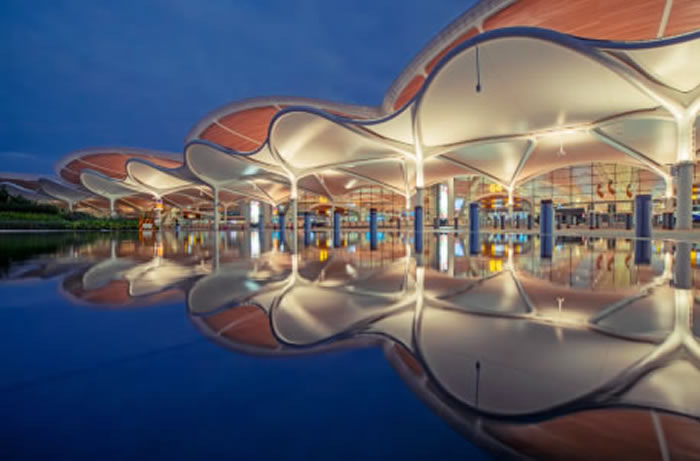廣州白云國際機場 T3 航站樓以 “羊城花冠” 為設計意象,融入 “云山珠水”“花城” 等城市特色,與綜合交通中心實現空鐵無縫 “零換乘”。隨著 T3 與第五跑道啟用,白云機場成為國內首個五跑道航空樞紐,近期年旅客吞吐量達 1.2 億人次,成為粵港澳大灣區多元文化交融互鑒的重要樞紐,有力推動區域文化協同發展與創新傳承。