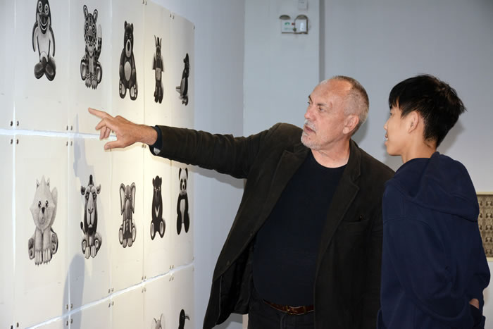 同樣與觀眾四目相視的是邁克爾·肯普森作品中的動物。它們外形可愛呆萌,如同卡通動漫中出現的形象,或是在商場兒童區最受小朋友喜愛的毛絨玩具?!皩游飩兯茉斐扇绱丝蓯鄣男螒B,源于我的個人經歷——你知道,我當爺爺了,因此在和孫子孫女一起成長的過程中,我也接納了他們眼中動物的模樣?!碑斎?,邁克爾的作品并非停留于此,當這些不同品種的動物排列在一起時,我們似乎會被它們那一雙雙又圓又大的眼睛“盯”到——大而圓的眼睛自然符合可愛的卡通感,但在它們直勾勾的目光中,我們似乎看到了一種更木訥或冷漠的“機械”意味。的確,邁克爾根據文化寓意的內涵用不同動物代表不同國家,通過作品中動物的象征性指涉人類國家之間的關系,它們外表看似整齊親人,但那無神的雙眼卻齊刷刷地暴露了“國家機器”的影子?!岸嬲鷦拥膭游飸撌腔铎`活現的,遵從自然法則以一種和諧的方式共存,這不僅是叢林的智慧,也應該是國家與國家之間的智慧?!彼囆g家本人說到。