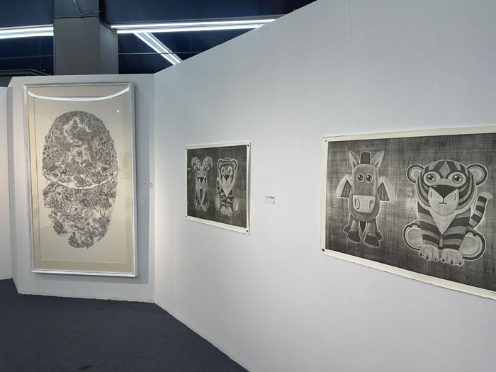 藝術家蘭錦斌的水墨動物則以“機甲風”示人。當十二生肖和機甲相合成,當紙本水墨線條與理性冰冷的機械構件相結合,強烈的視覺和心理沖擊不言而喻。這些“合成的動物”是時代異化的產物:它們的身體由各種管道、電線和鉚接面板等零件構成,似乎足夠自信地展示了當前技術在嘗試模擬動物的生命形態上所取得的“成果”,然而面對后工業文明對自然的影響,科技當真能夠改變自然甚至物種?這樣的干預到底孰是孰非?當“合成的動物”作為一種科技異化的新物種(比如電子狗),它是否能夠承載傳統“十二生肖”的文化意蘊呢?