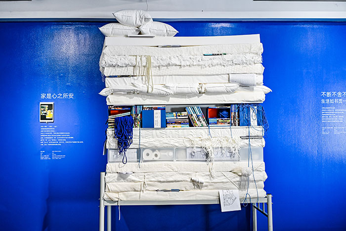 歐陽應霽以“打破邊界”的跨界創作著稱,在漫畫、文字、裝置、影像等領域自由穿梭,始終秉持“日常即藝術”的創作理念,將生活中的飲食、家居、器物轉化為富有溫度的藝術表達。2025年的《天天廚房》系列用玻璃鋼雕塑與瓦楞紙繪畫,構建出充滿童趣的飲食宇宙;《家是心之所安》裝置則以床褥、書籍等日常材料堆砌出“家”的意象,記錄三十多年對家居與親情的思考,二者共同詮釋出“藝術源于生活,又高于生活”的深層內涵。