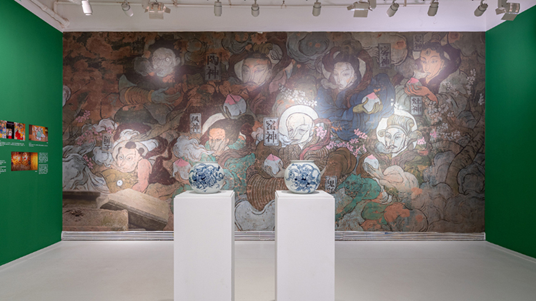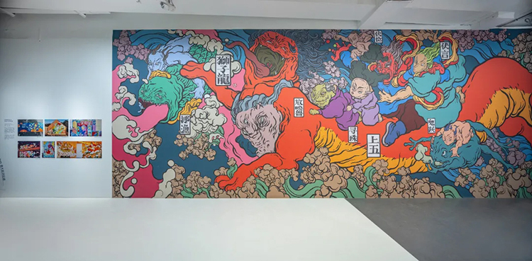 一樓的第四個展廳主要呈現文那的壁畫作品,在這里,文那選了兩幅最具代表性的作品做大型墻面還原。《三寶賦》是文那在三寶畫的最大的一面墻,講的是三寶所處的自然環境;《獅子龍圖》是文那受法國當代藝術博物館之邀創作的作品,里昂的名字意為“獅子”,文那則從中國帶來一條龍,融合成這幅《獅子龍圖》。