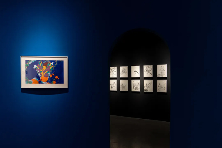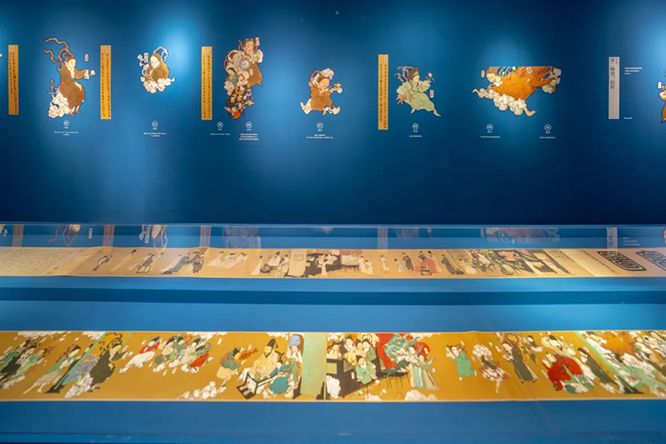 在展廳一樓最后的一個空間,展出的是文那對中國十大經典古畫中的《韓熙載夜宴圖》的再創作作品——《韓熙載宴仙圖》。畫作通過虛幻的場景和隱秘的敘事,呈現一個既令人驚嘆又疑惑的仙宴世界。