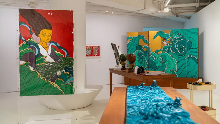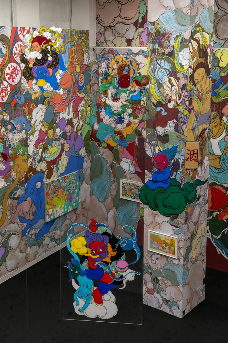 展廳最大空間呈現的是文那多年來創作的神仙形象,這些形象源自壁畫、卷軸、架上繪畫和年畫等原有媒介,此刻懸浮空中,猶如敦煌飛天。觀眾步入其中,恍如偶然窺見一方“野生神仙”逍遙揮灑、各顯神通的神奇世界。