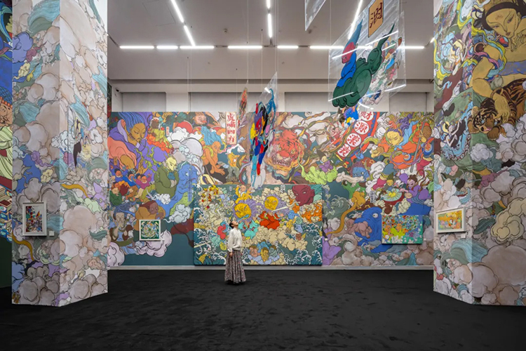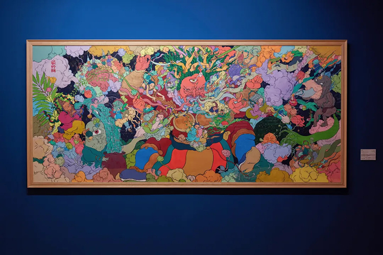 展廳的第一件作品是文那為此次展覽創作的《疆野圖》。這幅作品就像文那的一張大“創作地圖”,她將所有自己創作過的神仙和形象都畫在了這張畫里:畫中主神嘴里“吐”出的像云彩一樣的路,是文那走過的不同道路和經歷,包括她畫的壁畫、各種跨界合作、在歐洲走過的國家和所做項目等。那些隨著時光流逝可能會消失的墻壁、可能被搬走的雕塑,都永遠地留在了這一幅畫里,這是一張會隨著文那未來的創作被持續填充的未完結的地圖。
