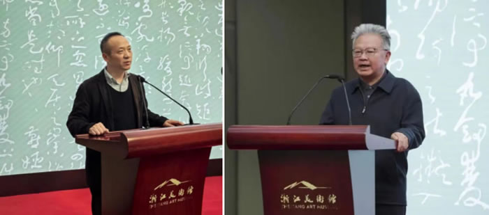 書法家張智重(左)致答謝詞;浙江省人大常委會原副主任劉力偉(右)宣布展覽開幕