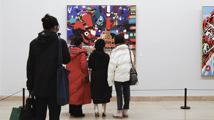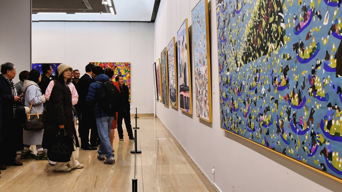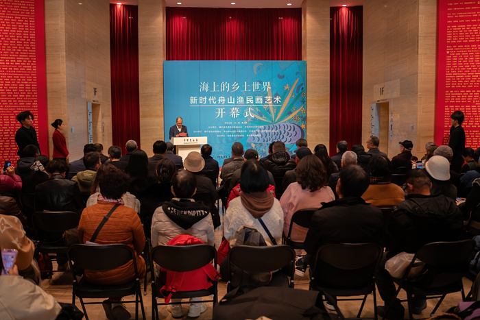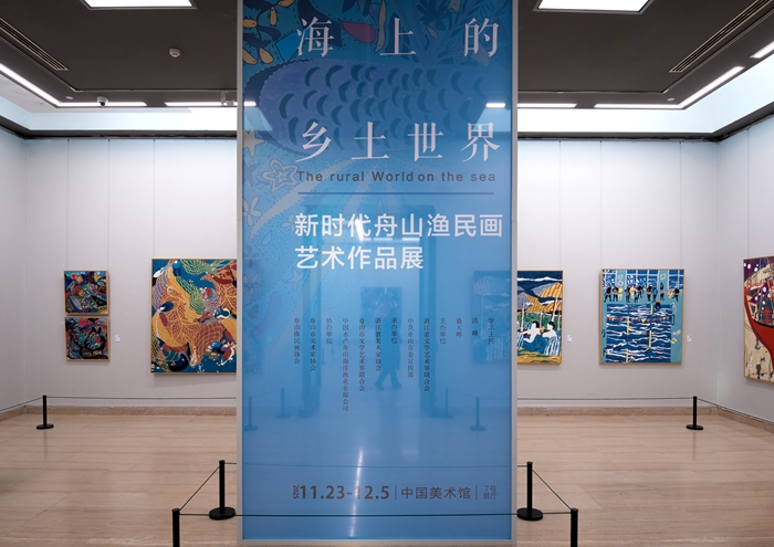 11月26日上午,由浙江省文學藝術界聯合會、中共舟山市委宣傳部聯合主辦的“海上的鄉土世界——新時代舟山漁民畫藝術作品展”在北京中國美術館開幕。
