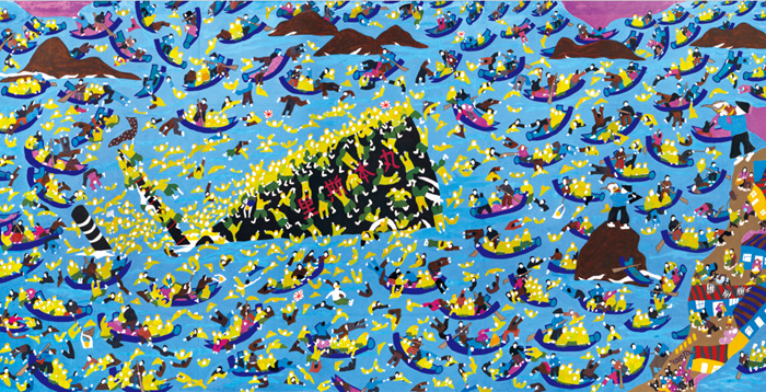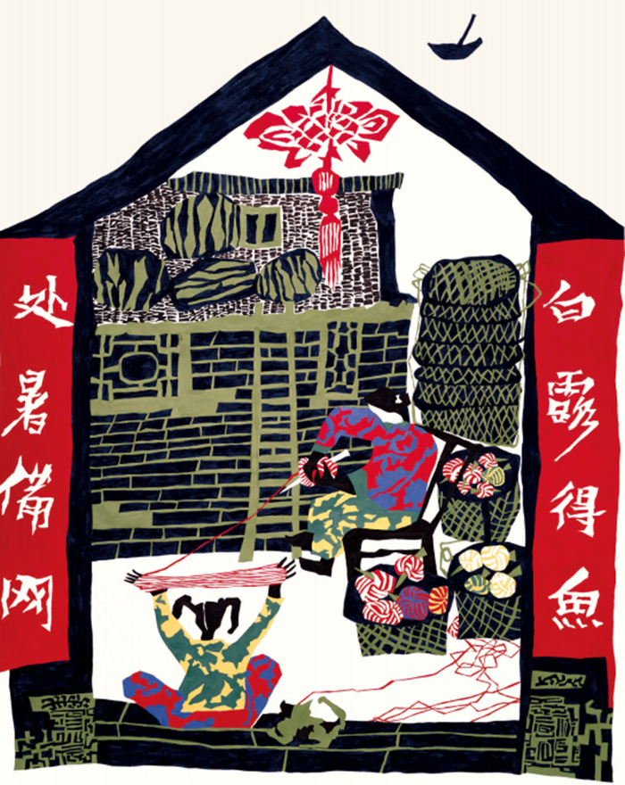 本次展覽以“海上的鄉土世界”為主題,共分“耕耘”“和美”“新曲”三個篇章。耕耘篇以“海上牧歌”為韻,26件作品將目光投向波濤之上的勞作與守望。作品以充滿本真之美的筆觸,將不同時空的勞動場景巧妙并置,讓日常的漁業勞作升華為人與自然的精神對話,在平涂色塊間流淌著同舟共濟的淳美鄉風。