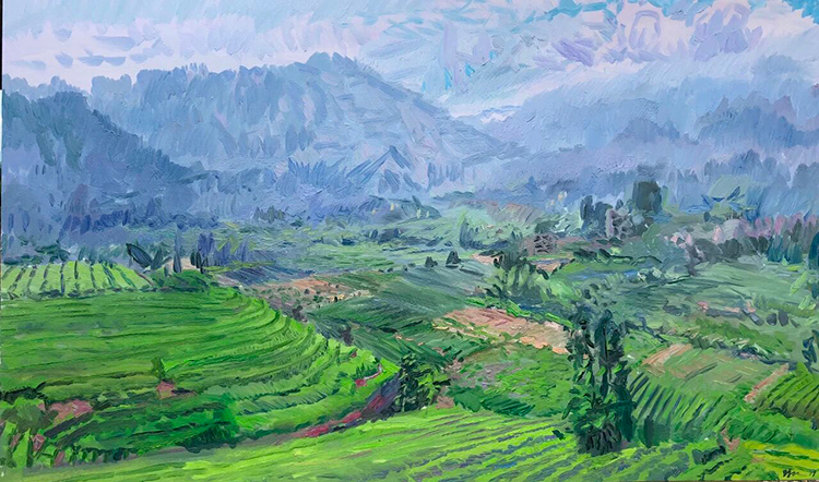 “現場的敘事”是張路江的工作方法?,F場如同包裹著他的巨大的信息場域,在這種場域中,他將看到的現實甄別莘取,轉化為作品的主題和敘事的語言,因此,在觀看張路江作品的時候,除了眼睛能識別出的圖像,還能感受到碼頭的腥鮮味、海鷗的鳴叫與海浪聲的交錯、炒茶房里的高溫與茶香、山間泥土的芬芳,畫面中的男男女女似曾相識以及農民對土地的依戀。當然遠遠不止于這些,“山?海?人”構成了張路江的閩緣。這種方式有別于對景寫生。他始終堅信藝術家的“在場”與腳下土地的“現場”共同構成了他藝術創作不可分割的經驗場。