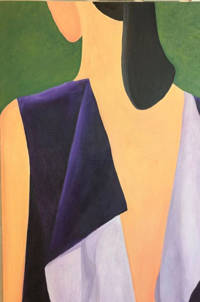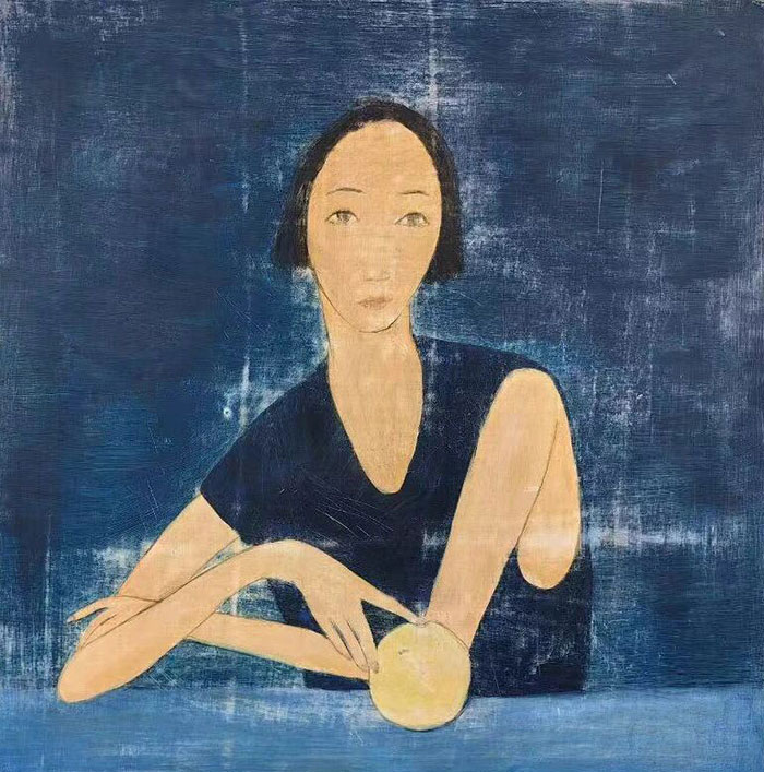 房瑩的這些作品,有一定的繪畫基礎,有初試古典的作品,又有點抽象的味道,在人物描繪中,看似面無表情或傻呆蒙蒙,還是長脖子細腿的造型,似乎違反了所謂繪畫的形準,而且哪都不靠,如此“哪都不靠”卻并非業余的標簽,而是一個真正找到自我聲音的藝術家的獨立宣言!此“不靠之美”恰好體現出一個女性藝術家自己的獨特想法,形成了自己從心所欲的獨特美感。這些簡約、平面化、設計感的表達,也恰好體現出設計師對布料、線條、空間的敏感,以此來繪畫就帶來了學不來的另一種繪畫性。