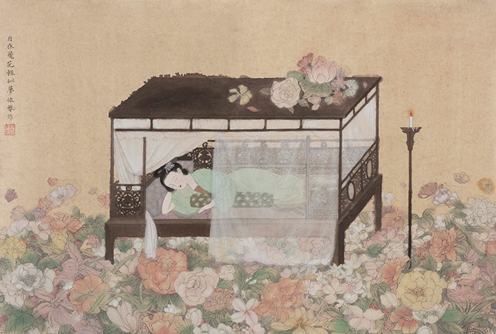 孫欣認為,王依雅的創作在當代新工筆繪畫的脈絡中延申,卓有成就。首先是“以幻為真”。王依雅將花這一顯性符號放大,碩大的花簇使殿宇成為畫面的點綴,打破了既有的圖像結構,強化了圖像的觀念性。女性的失語和自由,核心是其情感和觀念的深入覺醒。其次是“以實映虛”。王依雅經歷了嚴格的學院訓練,皇后冠作品面孔的留白,成為情感流動的切口。華冠實、面孔虛,仙船的煙波,使空幻成為無常的隱喻。最后是“以繁歸簡”。王依雅用繁復回應傳統的極簡,文人畫簡中見逸,而王依雅是繁中見簡,用“極多”引人深思。尤其是《上元》中的生命倏忽之感,讓人有格物致知的深思和共鳴。