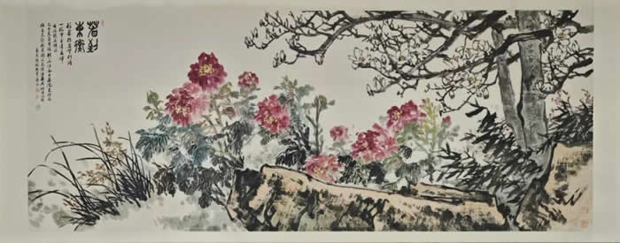浙江大學教授、杭州市文聯名譽主席、浙江西湖書畫院院長、新華江南詩書畫院終身學術顧問杜高杰,與中國美術家協會會員陳培林合作為本次雅集創作大幅國畫《春到東衡》(主辦方供圖)
