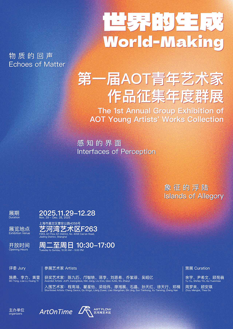 2025年11月29日, ArtOnTime(AOT)與藝河灣藝術區首次合作打造的“世界的生成 |World–Making—第一屆AOT青年藝術家作品征集年度群展”在上海市藝河灣藝術區F263正式啟幕,展覽展期為一個月,將持續至12月28日。