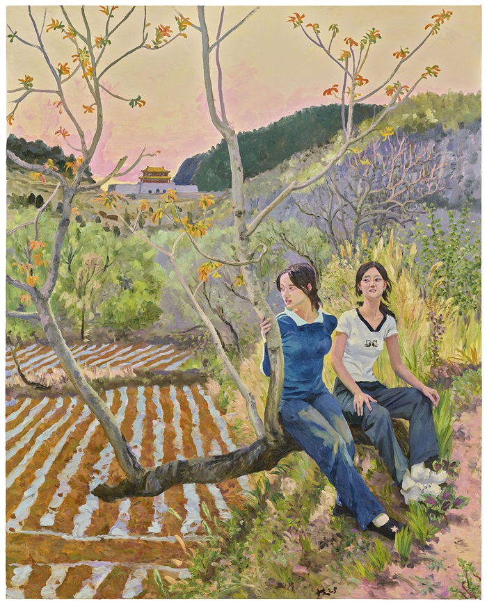他在作品中常常描繪家人,這既體現了溫情與致意,也是對自身、對時間的思索。家人同時是他作品的觀眾,給他以支持與鼓勵。他們是照見自我的鏡子,也是精神的港灣?!陡缸印分械母赣H像一座山一樣沉著冷靜。背景的火車站臺承載了遠行又回歸的記憶?!独蠇尅费笠缰鴾嘏姆諊拓S收的喜悅,母親照看著茁壯的蔬菜,令人感到踏實。他對喻紅和女兒的描繪注入了細膩的情感,成為他創作之路上一條綿延的線索。