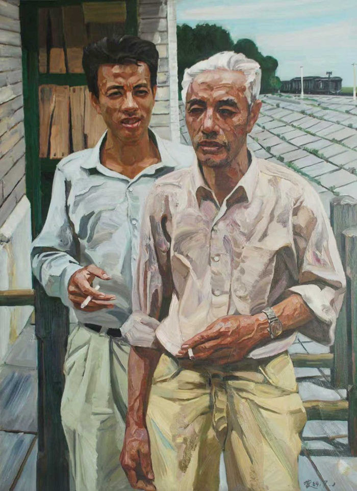 《父子》,亞麻布油畫,1989,130×97cm 承蒙劉鋼、陳育夫婦惠允