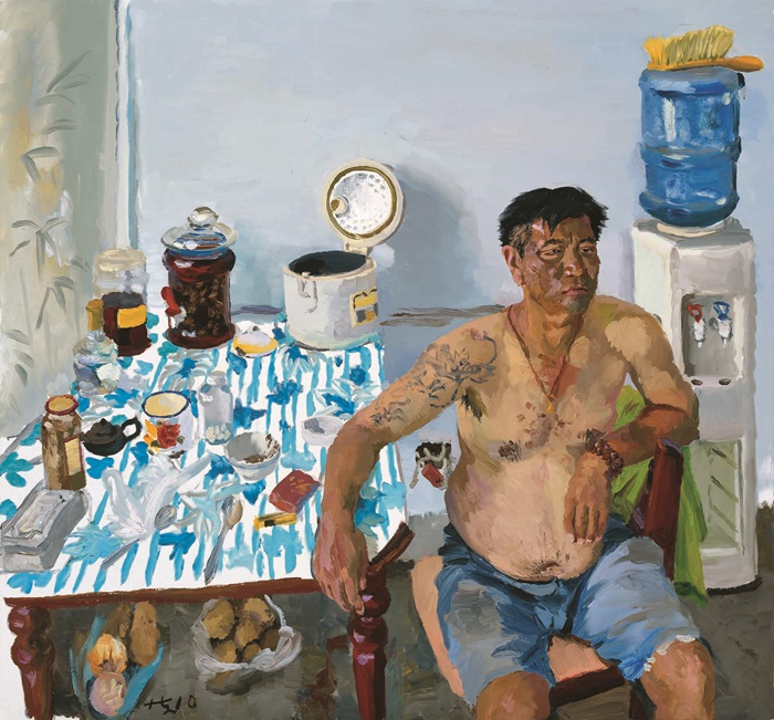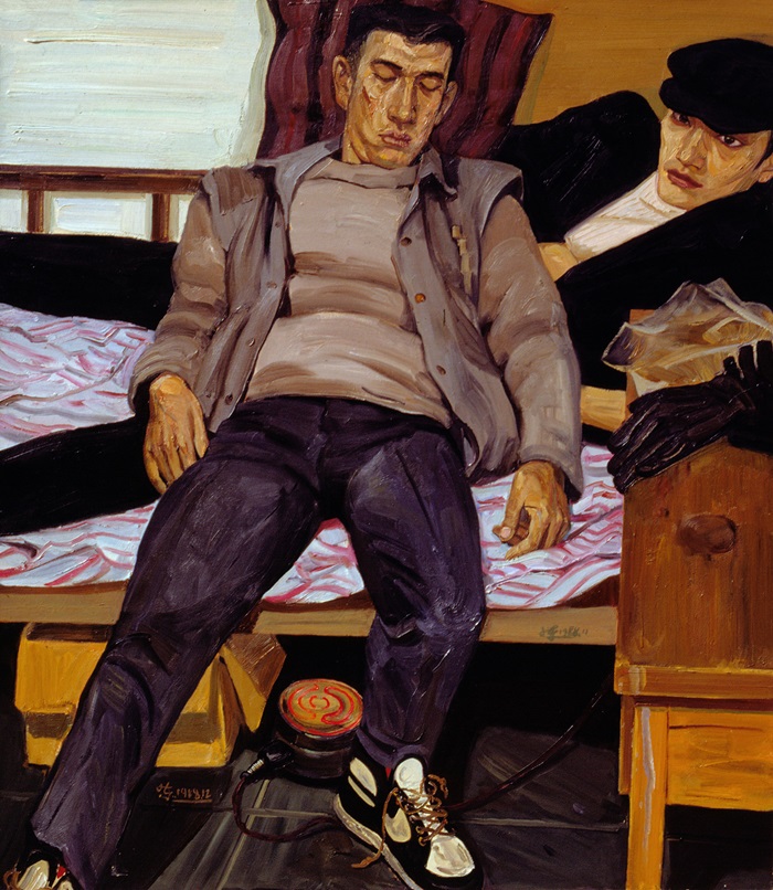 作品中經常出現有象征意義的物品,用策展人的話來說,總有一些元素打破畫面中的平衡,為畫面注入獨特的意味,強化了人物的內心活動。這一手法也貫穿了他之后的創作。比如《休息》中腳下的電爐、《心亂的男孩》桌子上雜亂的顏料與藥品。劉小東的繪畫構建了獨特的精神世界。
