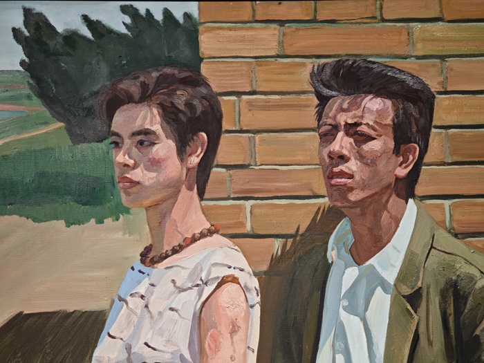 《田園牧歌》是他“新生代”階段的重要代表作。畫中劉小東和喻紅在陽光下并肩站立,斜倚著墻壁,看向遠方,男主人公瞇起了眼,眉頭微皺。作品就像電影的長鏡頭,把一秒鐘盡可能拉長,展開生活中的空白部分,訴說著愛情中的點滴狀態。