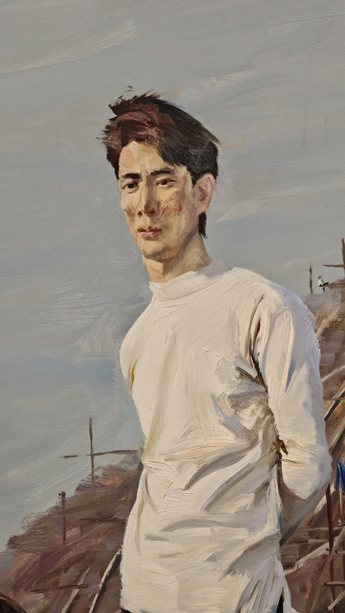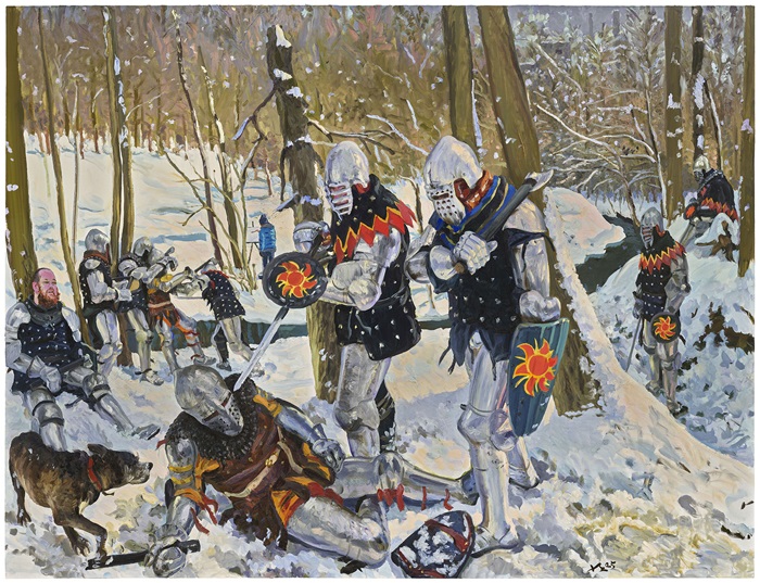 在2025年的新作中,他又去了底特律這座曾經輝煌的“鋼鐵之城”?!兜滋芈裳┕狻肥且粓鲅b扮游戲,是寒冬中的戰斗,是對中世紀的模仿,他們把身體隱藏在保護之下,整幅畫只有一張露出的臉。他覺得油畫是一種古典的媒介,很適合畫金屬。他還用多層敘事表現事件的推移?!短扉T關》展現了太行山區新一代青少年的形象。他改變以前印象派的色彩體系,轉而表現主觀的固有色,但他仍然展示出控制色彩關系的強大能力,洋溢著青春感。