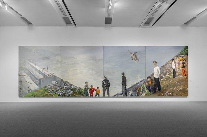 《三峽新移民》,亞麻布油畫,2004,300×1000cm ?泰康收藏“劉小東:河東,河西”展覽現場,泰康美術館,2025