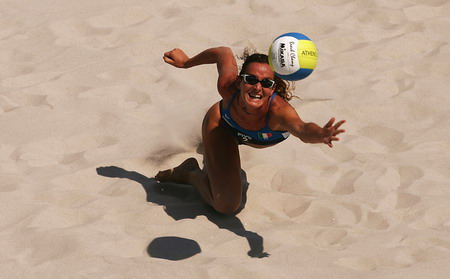 2004年8月19日:希臘雅典夏季奧運會在法里羅海灘奧林匹克綜合運動中心舉行的女子沙灘排球的預賽中,意大利對南非的比賽中,意大利選手丹妮拉奮力撲救。作者: Nick Laham/Getty Images/China Foto Press.