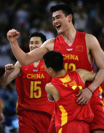 2004年8月23日,在雅典奧運會男籃小組賽最后一輪比賽中,中國隊以67-66掀翻世界冠軍塞黑隊,以小組第四的身份晉級八強。姚明與隊友慶祝勝利。作者: Stuart Hannagan/Getty Images/China Foto Press