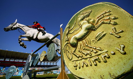 2004年8月24日,希臘雅典,雅典夏季奧運會,日本選手Tadayoshi Hayashi進行馬術個人障礙賽的比賽。作者: Donald Miralle/Getty Images/China Foto Press