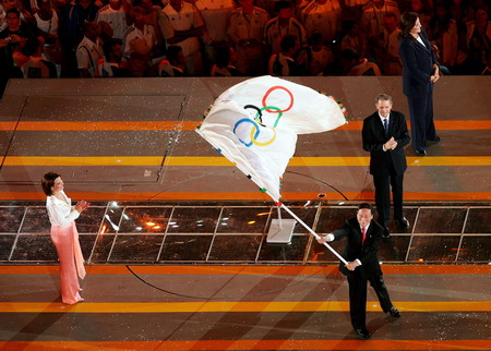 2004年8月29日,作為第29屆奧運會主辦城市,北京市市長王岐山在雅典奧運會閉幕式上接過奧運五環旗。作者:Stuart Franklin/Getty Images/China Foto Press